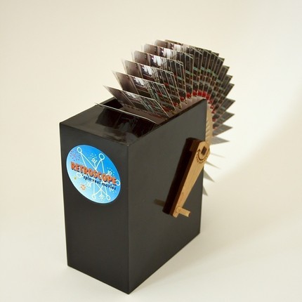 Retroscope (A flip book movie that goes round and round) Retroscopes are miniature versions of the old 'peepshow' style viewers. You turn the crank to see the movie. Turn slowly to see step by step action; turn the crank quickly to see the motion zip by. The reels are interchangeable so you can get extra movies. $45 plus shipping. Additional reels are available. |