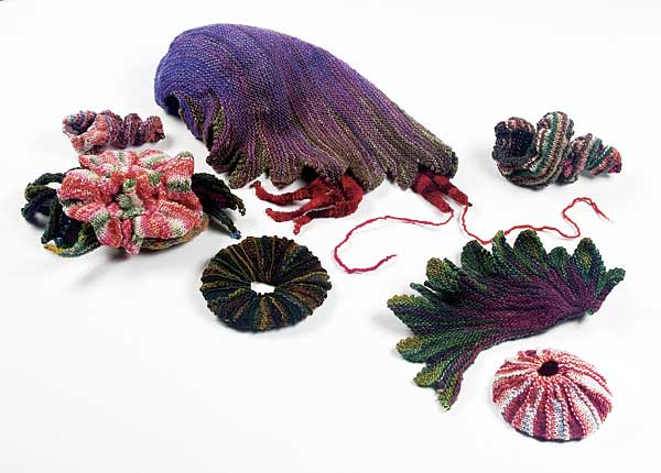 In this shorter workshop, returning jazzknitting students will meet together and continue their individual jazzknitting explorations. Students can try new forms or delve more deeply into their developing area of interest. If you'd like to try knitting beads into your work, bring large seed beads that have a hole big enough to accommodate your yarn. If you'd like to explore working with thicker yarn for larger sculptural forms, bring needles several sizes smaller than needles you'd use for that weight. If you'd like to make a beaded net for sewing your knittings onto, bring thread or monofilament pre-strung with many tiny seed beads and some extra large needles. If you'd like to try your hand at seashells, we'll reexamine all the ones in the bowl and find a place to start. If you have other art forms you're thinking of incorporating jazzknitting into, this would be a wonderful time to bring samples or pictures of your work so we can talk about ways to integrate the two.